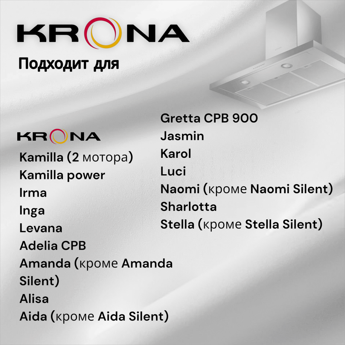Угольный фильтр Krona KU-2 — комплект из двух фильтров, предназначенных для моделей вытяжек Adelia, Gretta CPB 900, Hilda, Inga, Irida, Irma Sensor, Kamilla 600 (2 мотора), Kamilla Glass / E2M / Retro, Kamilla Power / LEVANA, Kamilla AIR 2.