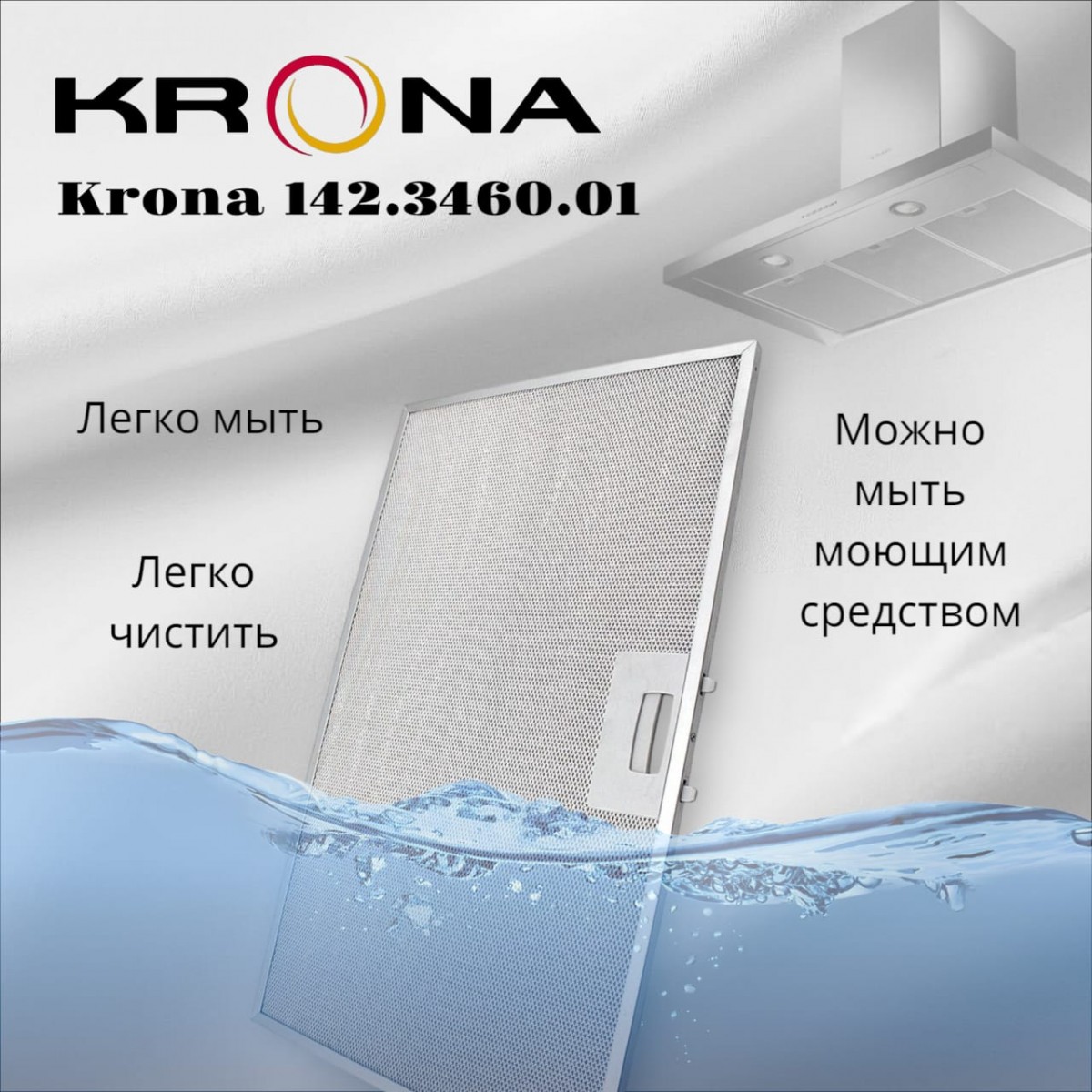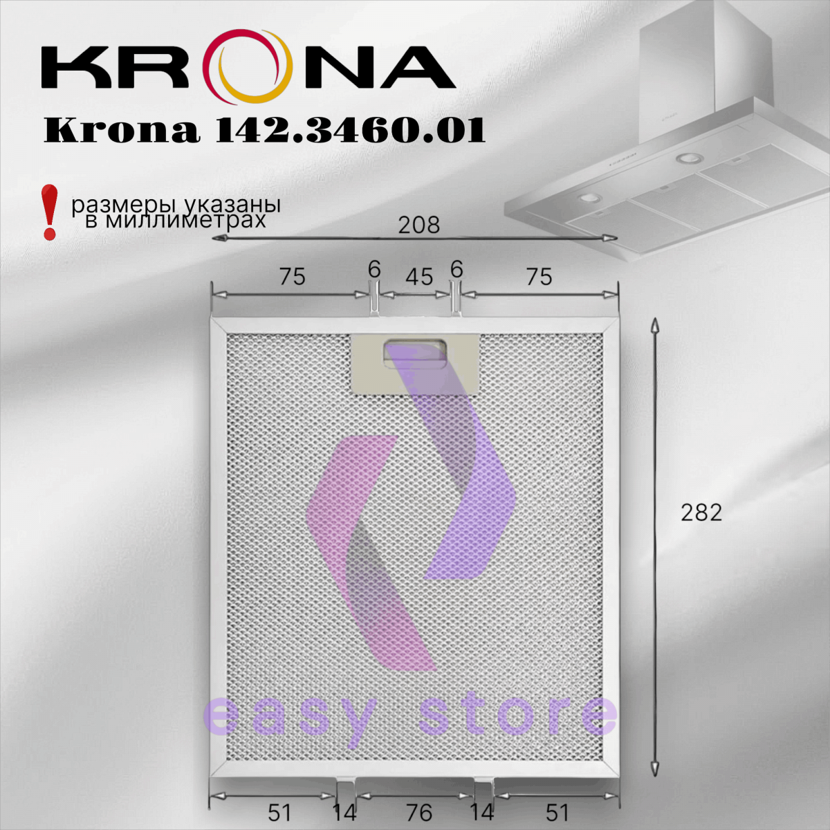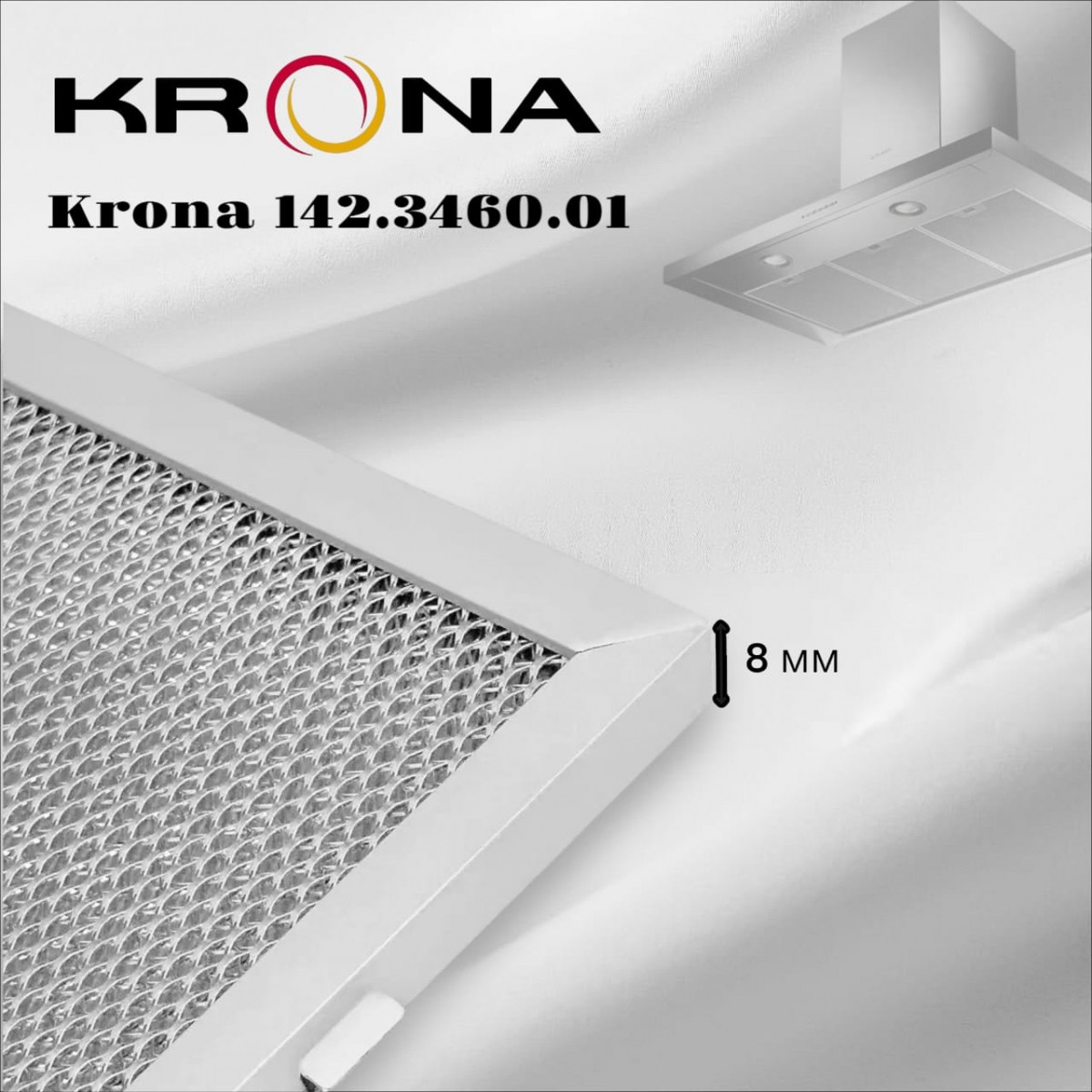 Алюминиевый фильтр Krona 142.3460.01 с крепежом подходит для кухонных вытяжек Krona ELMA 600 PB, ESTER 600 PB. Размеры: длина 282 мм, ширина 208 мм.